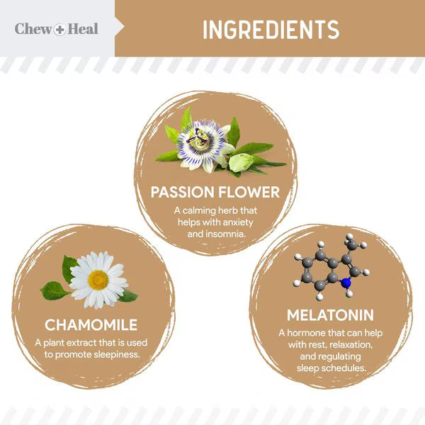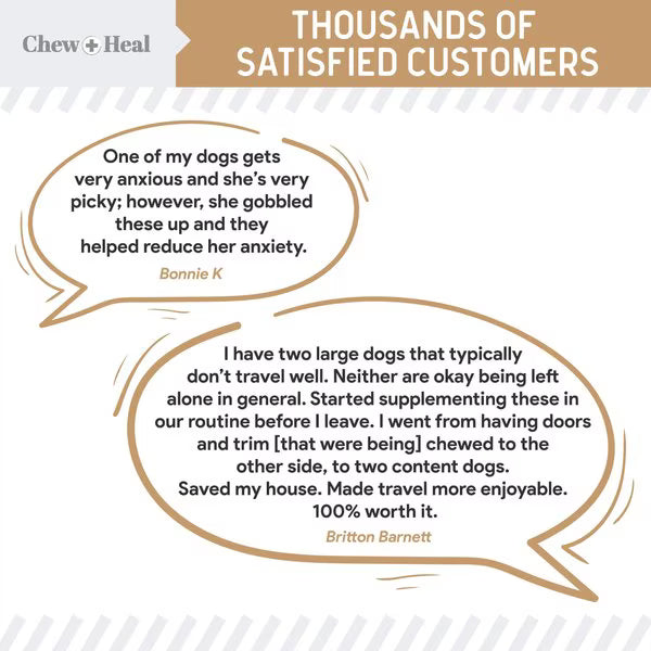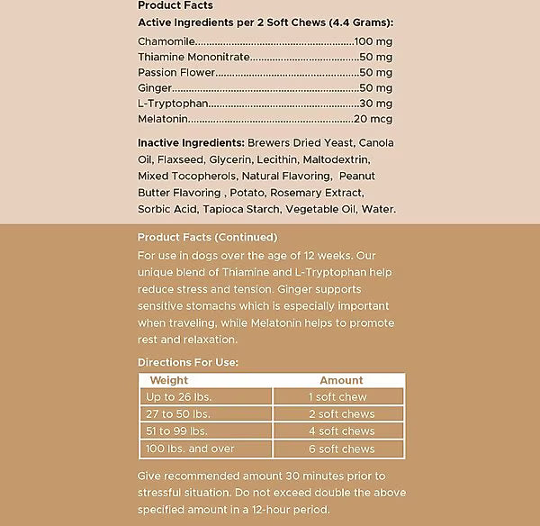 • These calming treats for dogs help reduce anxiety and curb behaviors like excessive barking or hyperactivity during stressful situations like car rides, thunderstorms, and more.