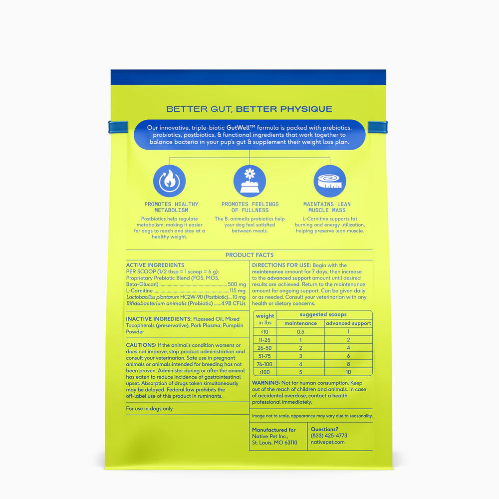 Proprietary Prebiotic Blend (FOS, MOS, Beta-Glucan), L-Carnitine, Proprietary Postbiotic Blend (Lactobacillus plantarum HC2W-90), Proprietary Probiotic Blend (Bifidobacterium animalis)