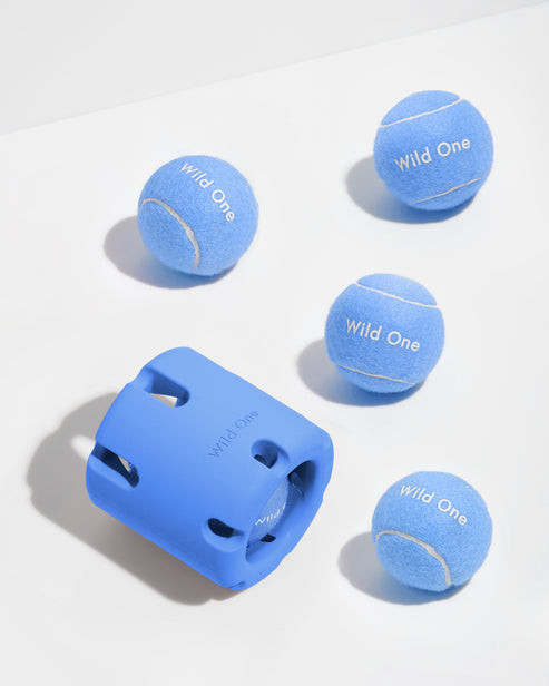 The Tennis Tumble is designed for solo play, offering a challenge to your pup that will keep them busy and build developmental skills. If retrieval of the ball is too challenging and takes an extended period of time, we recommend helping them dislodge it to show them it's possible and to reward them for their effort.
