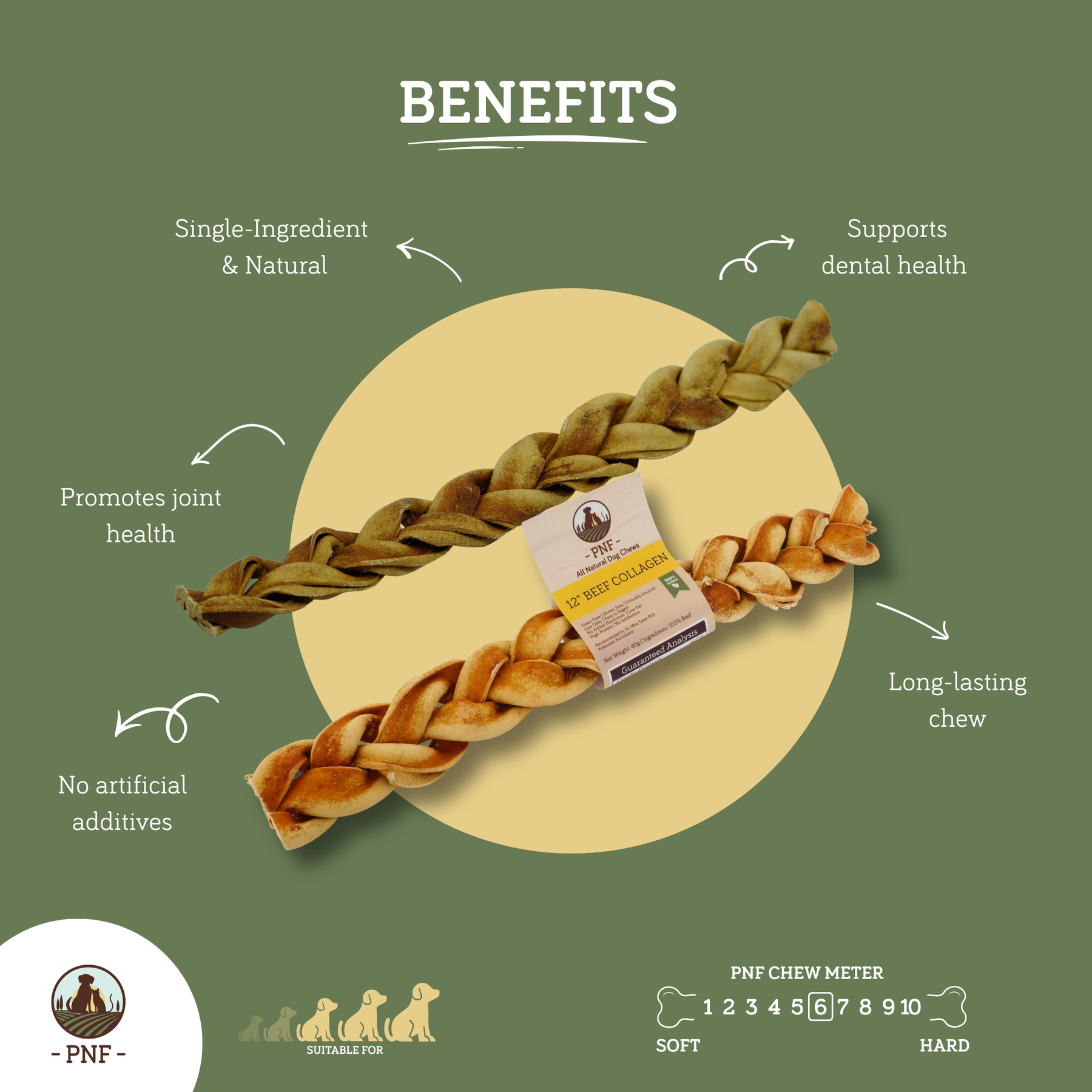 Our 12" Braided Beef Collagen chew are tough chews that will keep your dog entertained for a long time. These chews are high in protein, low in fat, and tough, making them the perfect choice for natural enrichment and dental care, while also providing long-lasting enjoyment.